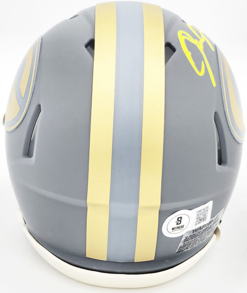 This is a Green Bay Packers Slate Gray Speed Mini Helmet that has been hand signed by Josh Jacobs. This item has been witnessed and certified authentic by Beckett Authentication (BAS) and comes with their tamper-proof witness sticker.