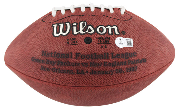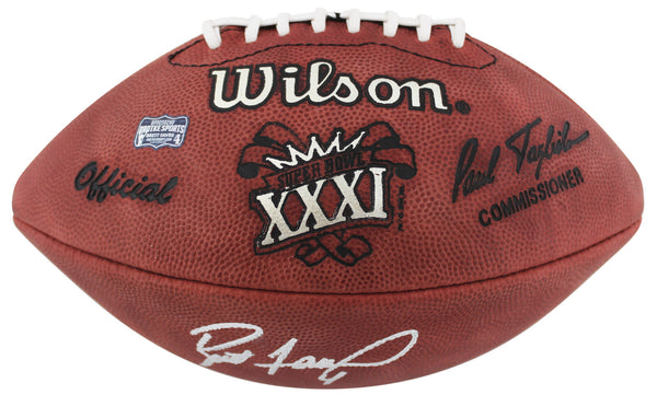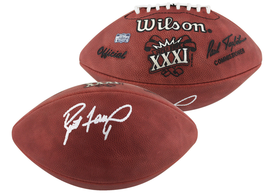 This Autographed Official Wilson "The Duke" Super Bowl XXXI Logo Nfl Football has been Personally Signed by Brett Favre of the Green Bay Packers. This item is 100% Authentic to include a hologram by Beckett Authentication Services. This item will come with an affixed Beckett Authentication Services (BAS) authentication sticker, which includes a scannable QR code to verify authenticity. Please note that Beckett no longer provides serial-numbered COA cards, and the attached BAS sticker will serve as the complete authentication for this item. This is a BAS Witnessed Protection Program item which means a Beckett Authentication Service representative was present when this item was being signed. The authenticity can be verified on Beckett Authentication Services website.