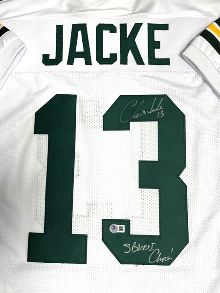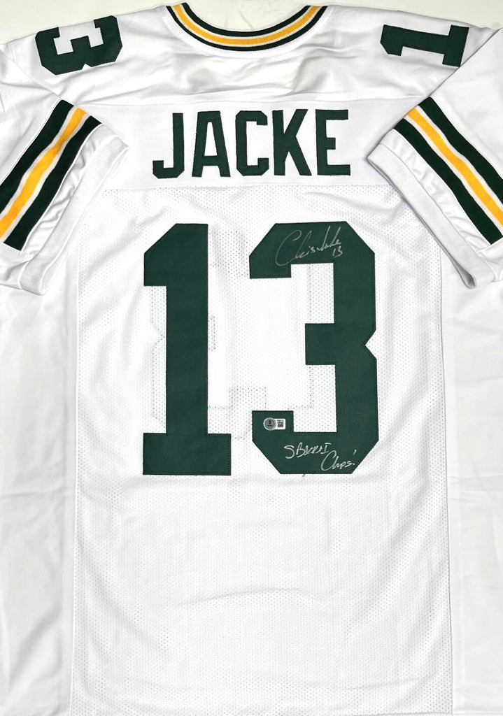 Custom Replica Jersey of Green Bay Packers Super Bowl Champion Kicker CHRIS JACKE. This jersey is signed with Silver paint pen and includes the inscription "SB XXXI Champs". This jersey is size XL and has all letters and numbers sewn in. This item was signed at a private signing with us and would make a great addition to any Packers collection. This item is guaranteed to be 100% authentic and will include a COA hologram from Beckett Authentication.