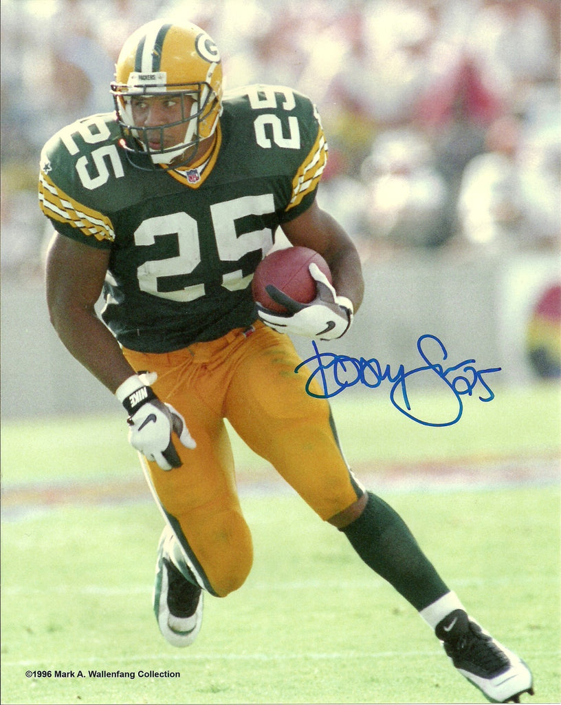 An 8x10 hand signed color photo of former Green Bay Packer Super Bowl XXXI superstar DORSEY LEVENS. The signature is in Blue sharpie. Levens was a member of the the Green Bay Packers Super Bowl XXXI Championship team. This photo was signed at a public signing in the Milwaukee area. This item is guaranteed to be 100% authentic and will include a COA with matching tamper proof Holograms.
