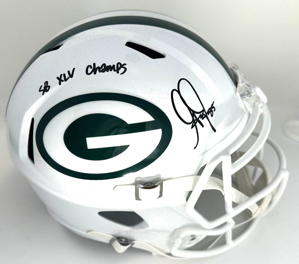 Riddell Full Size 2024 ALTERNATE WHITE OUT Replica Speed Helmet hand signed by Green Bay Packers Receiver GREG JENNINGS. The signature is in Black Paint Pen with the inscription "SB XLV Champs". This would make a great addition to any Packers collection.This item was signed at a private signing with us. This item is guaranteed to be 100% authentic and will include a COA hologram from Beckett authentication.