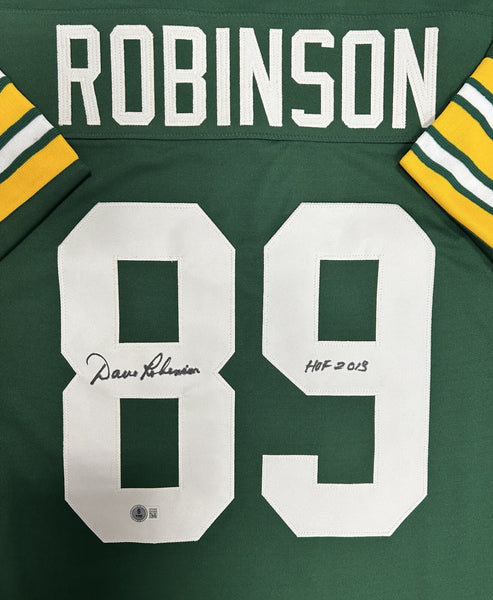 Custom Replica jersey hand signed by Green Bay Packers Hall of Famer DAVE ROBINSON. The signature is in Black sharpie with the inscription "HOF 2013". This jersey was signed at a private signing with us and would make a great addition to any Packers collection! The jersey size is XL and all letters and numbers are sewn in.This autograph is guaranteed to be 100% authentic and will include a COA hologram from Beckett Authentication.