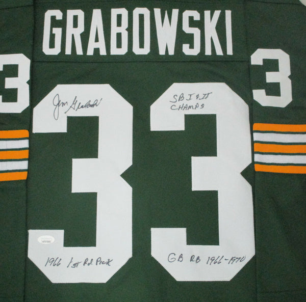 Custom Replica Jersey hand signed by Green Bay Packers running back DONNY ANDERSON. The signature is in Black Sharpie with the inscriptions "1966 1st Rnd Pick, SB I & II Champs, GB RB 1966-70". This Item was signed at a public signing and would make a great addition to any Packers collection! The jersey is size XL and all letters and numbers are sewn/stitched on This item is guaranteed to be 100% authentic and will include a COA from JSA authentication.
