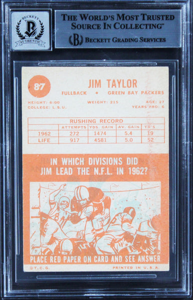 This Autographed Auto Graded Gem Mint 10! 1963 Topps #87 Card has been Personally Signed by Jim Taylor of the Green Bay Packers. This item is 100% Authentic, it comes slabbed and authenticated by Beckett Authentication Services. The authenticity can be verified on Beckett Authentication Services website.