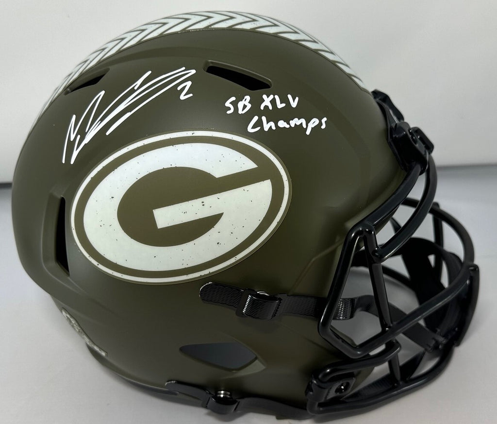 Riddell full size 2022 SALUTE TO SERVICE Replica Speed Helmet hand signed by Green Bay Packers Super Bowl XLV Champion MASON CROSBY. The signature is in Green Paint Pen and includes the inscription "SB XLV Champs". This item was signed at a private signing and would make a great addition to any Packers collection! This item is guaranteed to be 100% authentic and will include a COA from from JSA authentication.