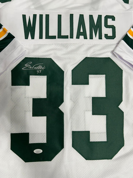 Custom Replica jersey hand signed by Green Bay Packers Safety EVAN WILLIAMS. The signature is in Silver paint pen. This jersey was signed at a private signing with us and would make a great addition to any Packers collection! The jersey size is XL and all letters and numbers are sewn in. This autograph is guaranteed to be 100% authentic and will include a COA from JSA authentication.