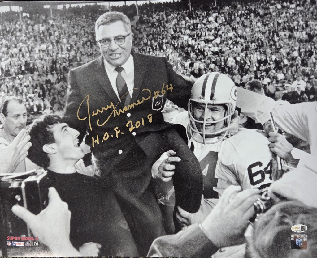 A 16x20 hand signed photo of former Green Bay Packer legend JERRY KRAMER. The signature is in Gold paint pen and contains the inscription "HOF 2018". JERRY KRAMER was member of the Packers Super Bowl I & II championship teams. This was signed at a public signing in our store. Great addition to any Green Bay Packer collection! This item is guaranteed to be 100% authentic and will include a COA from JSA (James Spence Authentication).