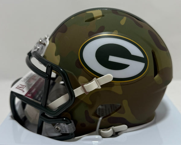 Riddell Camo Mini Helmet hand signed by Green Bay Packers Super Bowl XLV Champion MASON CROSBY. The signature is in White Sharpie. This item was signed at a private signing and would make a great addition to any Packers collection! This item is guaranteed to be 100% authentic and will include a COA from from JSA authentication.