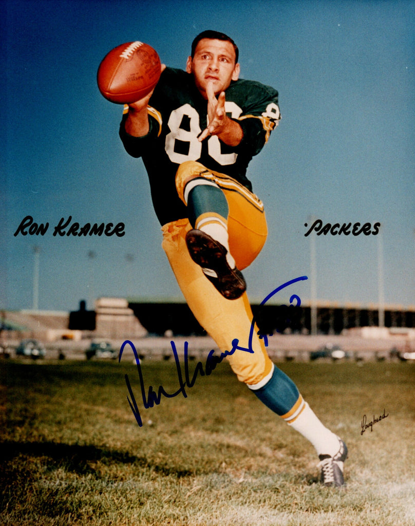 An 8x10 hand signed photo of former Green Bay Packer legend RON KRAMER (deceased). The signature is in BLUE sharpie. KRAMER was a member of the Packers 1961 & '62 championship teams.. This photo was signed at a public signing in our store and would make a great addition to any Kramer or Packers collection. This item is guaranteed to be 100% authentic and will include a COA with matching serial numbered holograms.