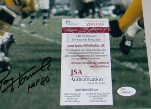 Jim Taylor and Paul Hornung, former Hall of Fame running backs for the Green Bay Packers, have each hand signed this 16x20 photo at a private signing. This item comes with a certificate of authenticity (COA) from JSA - James Spence Authentication and was signed in the presence of one of their representatives. You will receive a serial-numbered COA along with a matching serial-numbered sticker on the photo. The authenticity can be verified online by entering the serial number.Item pictured may not be the exact item you will receive. It will be similar quality, and we guarantee your satisfaction.