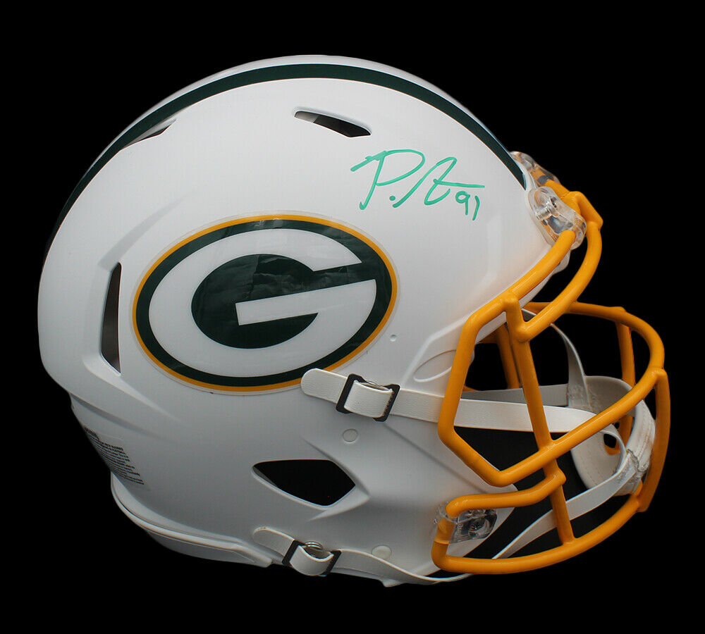 A Green Bay Packers Speed Authentic White Matte NFL Helmet Hand Signed by Preston Smith. The signature and item are in excellent condition. Preston is an outside linebacker for the Green Bay Packers. He played college football at Mississippi State University and was drafted by the Washington Redskins in the second round of the 2015 NFL Draft. AUTHENTICATION: The item is accompanied by a Certificate of Authenticity - Serial Numbered and Databased Hologram - Picture of Preston from the signing