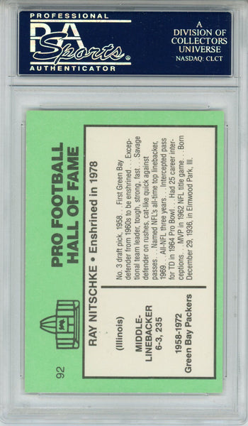 Ray Nitschke Autographed 1985 Football Immortals #92 Trading Card PSA Slab 43742 The number in the listing title is just an inventory sku for our records and is not the authentication number. This is the exact item that you will receive so please see pictures for condition. This is a trading card that was personally autographed by Ray Nitschke. This has been professionally slabbed by Professional Authentication Services (PSA) and includes a certificate of authenticity from Denver Autographs.