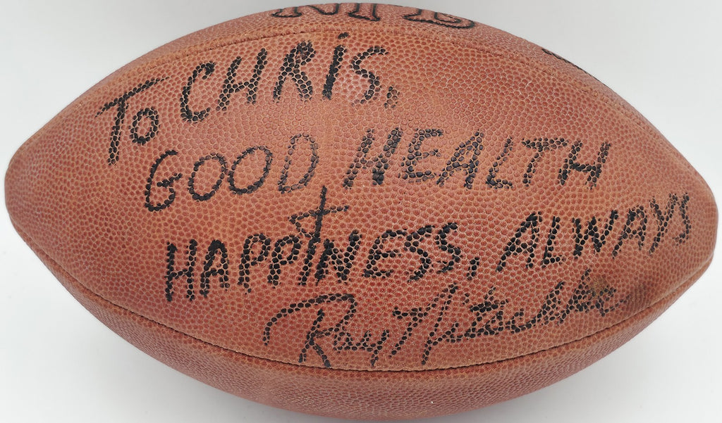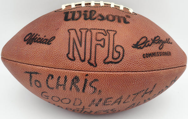 This is an Official NFL Wilson Leather Game Football that has been hand signed by Ray Nitschke. This item was inscribed "To Chris." This item has been certified authentic by Beckett Authentication (BAS) and comes with their tamper-proof QR Code hologram.