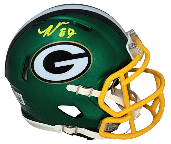 Romeo Doubs, star wide receiver for the Green Bay Packers, has hand signed this Packers Riddell Speed Flash mini helmet at a private signing. This item is authenticated by Beckett Authentication Services and was signed in the presence of one of their representatives. Their tamper-evident hologram featuring a QR code and serial number is on the item. The authenticity can be verified online by entering the serial number or scanning the QR code.Item pictured may not be the exact item you will receive. It will be similar quality, and we guarantee your satisfaction.