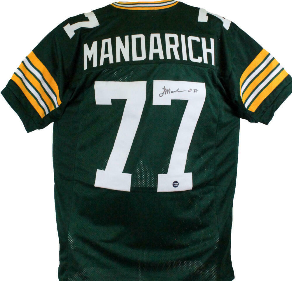Tony Mandarich Autographed Green Pro Style Jersey-Prova *Black THIS IS NOT AN NFL JERSEY. THIS HAS NO TAGS, NO LOGOS, NO EMBLEMS. This is a Hand Autographed Jersey of Tony Mandarich on a custom made (Non Name Brand) authentic style (Stitched Letters and Numbers) jersey. This item has a Prova Authentication, which comes with a Prova #'ed Sticker. You can view this item on the Prova website, it shows when and where the item was signed. It was signed either at a public autograph appearance or a private signing. This is a stock photo of the item. Although you may not receive this exact item, the item you receive is virtually identical and brand new in great shape. Jersey size is XL.