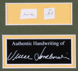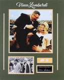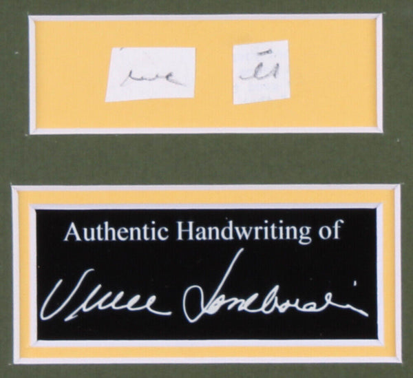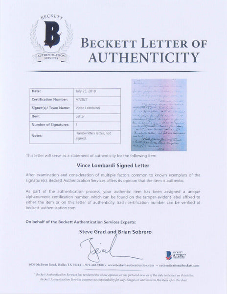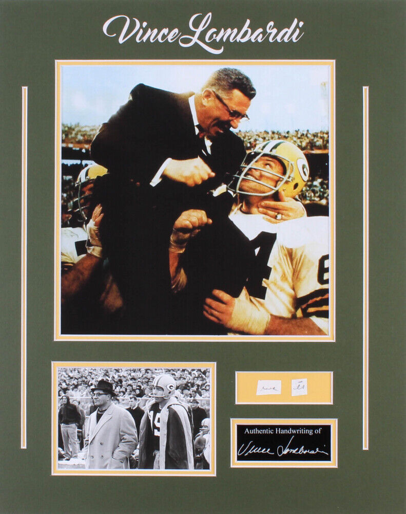 Custom Matted Photo Display measures 16" x 20" in size and features a cut from a letter that has been penned by the hand of Vince Lombardi (D. 1970, Green Bay Packers, HOF) in black dip pen. Please note that Lombardi's signature is a facsimile. The lot / autograph(s) includes an official Beckett Authentication Services hologram and matching LOA for authenticity purposes.Authentication: Beckett LOA
