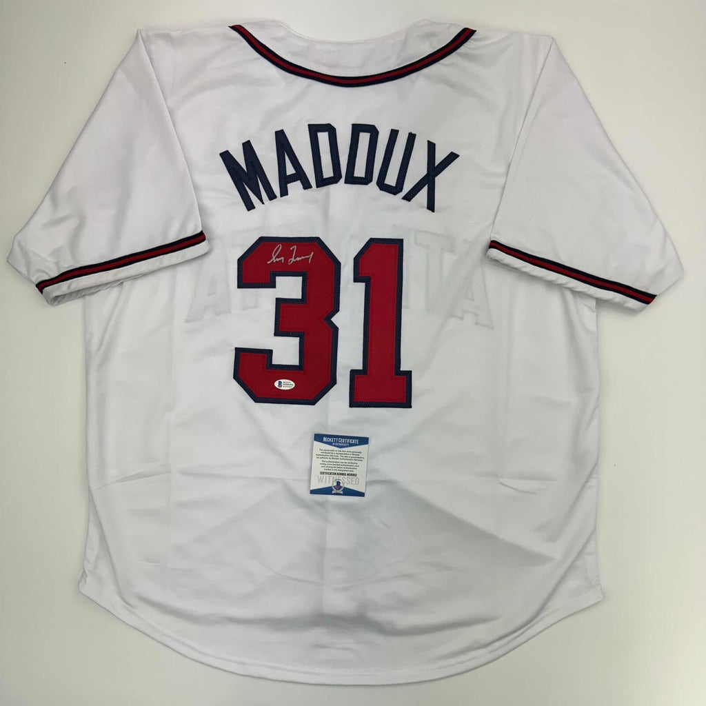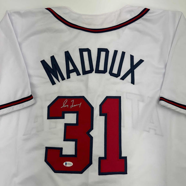 Autographed/Signed Greg Maddux Atlanta White Baseball Jersey Beckett BAS COA Jersey has no brand names or logos. This is a custom jersey and was not manufactured by or in any manner associated with any professional sports league or manufacturer. This custom jersey carries no professional sports league designation. The item is intended to be an autographed collectible. The custom jersey displays the name and number of the player. This item in no way is affiliated with or connected to any professional sports organization. Size is XL.