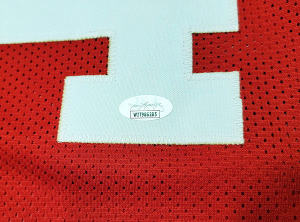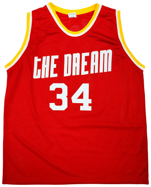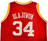 This is a Red Jersey that has been hand signed by Hakeem Olajuwon. This is a custom jersey with no name brand. The approximate size is XL. It has nice sewn in name and numbers. This item has been certified authentic by JSA and comes with their tamper-proof sticker and matching certificate of authenticity.