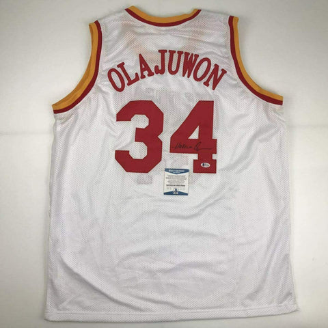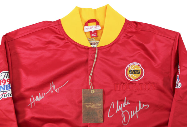 This Autographed Red Mitchell & Ness Bomber Jacket has been Personally Signed by Hakeem Olajuwon & Clyde Drexler of the Houston Rockets. This item is 100% Authentic to include a hologram by Beckett Authentication Services. This item will come with an affixed Beckett Authentication Services (BAS) authentication sticker, which includes a scannable QR code to verify authenticity. Please note that Beckett no longer provides serial-numbered COA cards, and the attached BAS sticker will serve as the complete authentication for this item. This is a BAS Witnessed Protection Program item which means a Beckett Authentication Service representative was present when this item was being signed. We conducted an autograph signing with Hakeem Olajuwon & Clyde Drexler where multiples of the same item were signed. While the photographs are representative of this item, the size, placement and strength of the signature may vary. Each item is hand signed, therefore, each autograph is unique. This item can be verified through BAS Witnessed.