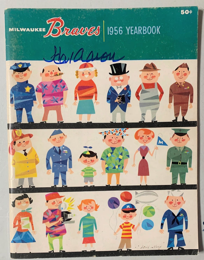 A VINTAGE 1956 Milwaukee Braves Official Yearbook program (magazine) hand signed by MILWAUKEE BRAVES HALL OF FAMER HENRY HANK AARON (Deceased). The signature is in Blue sharpie. This UNIQUE item was signed at a private signing with us. This would make a great addition to any AARON or BRAVES collection! This item is guaranteed to be 100% authentic and will include a COA with matching serial numbers from JSA (James Spence Authentication) as well as a photo of Mr. Aaron signing the item.