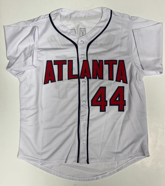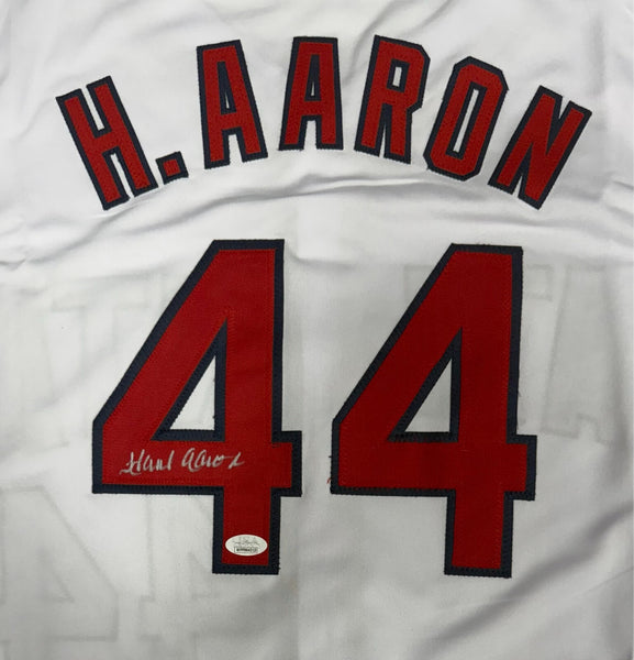 autographed Replica Custom Atlanta Braves Jersey of Braves and Brewers Hall of Famer HANK AARON. This jersey is signed with Silver sharpie. This jersey is size Medium with all letters and numbers sewn in. This item was signed at a private signing with us and would make a great addition to any Hank Aaron collection. This autograph is guaranteed to be 100% authentic and will include a COA from JSA authentication.
