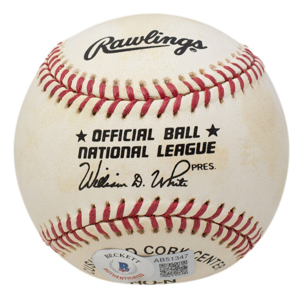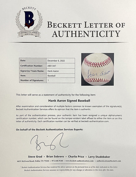 Featured is a Hank Aaron Milwaukee Braves signed official National league baseball. This baseball was hand signed by Hank Aaron and authenticated by Beckett authentication services. Included with the baseball is an Beckett hologram and letter of authenticity. This item would make a great addition to any sports memorabilia collection! SPECIFICATIONS Autographed By: Hank Aaron Team: Milwaukee Braves Sport: Baseball Authentication: Beckett Grading Services