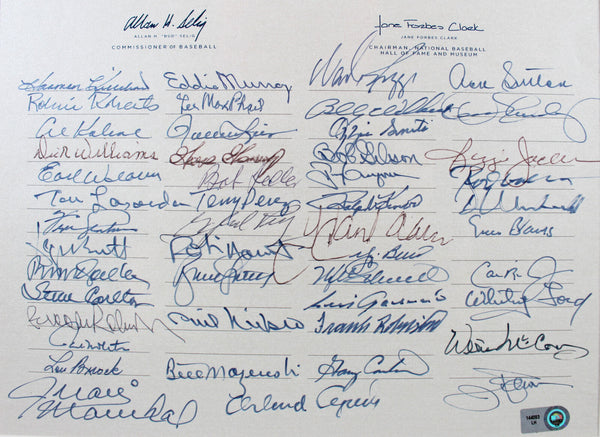 This Autographed 9.25x13.5 2008 MLB All Star Game Hall Of Fame Celebration Invitation Framed Display has been Personally Signed by Hank Aaron, Luis Aparicio, Ernie Banks, Yogi Berra, Wade Boggs, George Brett, Lou Brock, Rod Carew, Gary Carter, Steve Carlton, Orlando Cepeda, Dennis Eckersley, Bob Feller, Rollie Fingers, Whitey Ford, Bob Gibson, Goose Gossage, Tony Gwynn, Reggie Jackson, Fergie Jenkins, Al Kaline, Harmon Killebrew, Ralph Kiner, Tommy Lasorda, Lee MacPhail, Juan Marichal, Willie Mayes, Bill Mazeroski, Willie McCovey, Joe Morgan, Paul Molitor, Eddie Murray, Phil Niekro, Jim Palmer, Tony Perez, Gaylord Perry, Cal Ripken Jr., Robin Roberts, Brooks Robinson, Frank Robinson, Ryne Sandberg, Mike Schmidt, Ozzie Smith, Bruce Sutter, Don Sutton, Earl Weaver, Billy Williams, Dave Winfield & Robin Yount. This item is 100% Authentic to include a numbered hologram from MLB. The authenticity can be verified on MLB website. This item has been professionally framed to overall dimensions of approximately 19.5 x 23.5 inches. These signed invitations were sent out to all living members of the Baseball Hall Of Fame in 2008, 49 members accepted and were honored at the 2008 MLB All-Star Game, in the old Yankees stadium prior to it being demolished. These framed displays were given to the members of the Hall Of Fame that attended, unfortunately we do not know who the member of the hall of fame this belonged to as this was obtained from a family estate without that information. This is a scarce item with multiple legendary MLB players perfect for the baseball collector!