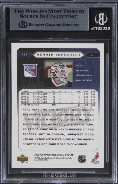 This Autographed 2005 Upper Deck Victory #288 Card has been Personally Signed by Henrik Lundqvist of the New York Rangers. This item is 100% Authentic, it comes slabbed and authenticated by Beckett Authentication Services. The authenticity can be verified on Beckett Authentication Services website.