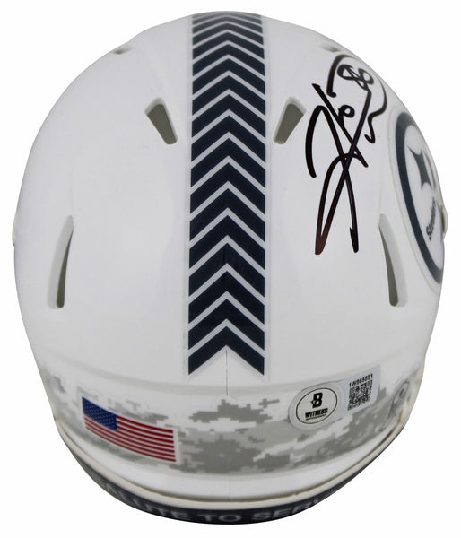 This Autographed Alternate 2024 Salute To Service III Speed Mini Helmet has been Personally Signed by Hines Ward of the Pittsburgh Steelers. This item is 100% Authentic to include a hologram by Beckett Authentication Services. This item will come with an affixed Beckett Authentication Services (BAS) authentication sticker, which includes a scannable QR code to verify authenticity. Please note that Beckett no longer provides serial-numbered COA cards, and the attached BAS sticker will serve as the complete authentication for this item. This is a BAS Witnessed Protection Program item which means a Beckett Authentication Service representative was present when this item was being signed. We conducted an autograph signing with Hines Ward where multiples of the same item were signed. While the photographs are representative of this item, the size, placement and strength of the signature may vary. Each item is hand signed, therefore, each autograph is unique. This item can be verified through BAS Witnessed.