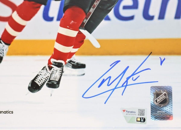 The product is an 8x10 photo of Cale Makar, autographed in blue pen, showcasing him playing for Team Canada at the 4 Nations Faceoff 2025 event. It is an original autograph authenticated by Fanatics Authentic.