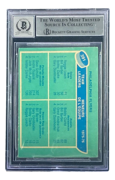 Featured is a Reggie Leach, Bob Clarke, Dave Schultz and Bill Barber signed 1976-77 O-Pee-Chee #391 Philadelphia Flyers trading card. This card has been hand signed by Leach, Clarke, Schultz and Barber and has been authenticated and encapsulated by Beckett, receiving autograph grades of 10. This card would make a great addition to any sports memorabilia collection! SPECIFICATIONS Autographed By: Team: Philadelphia Flyers Sport: Hockey Authentication: Beckett Grading Services