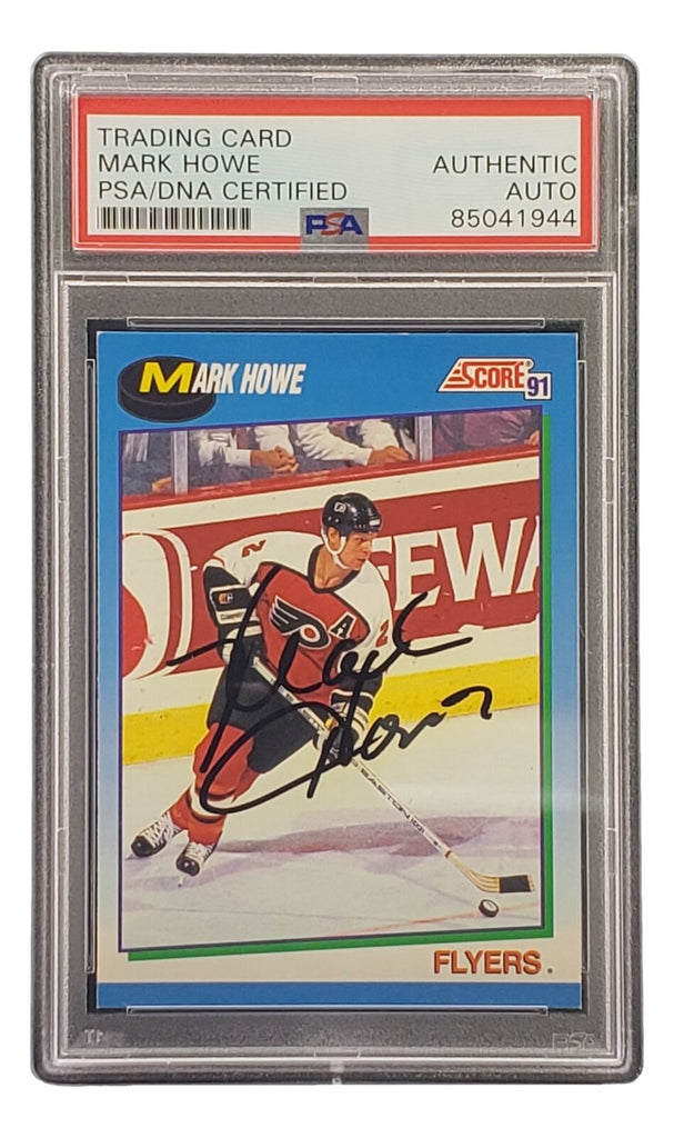 Featured is a Mark Howe signed 1991 Score #472 Philadelphia Flyers hockey card. This card has been hand signed by Howe and has been authenticated and encapsulated by PSA. This card would make a great addition to any sports memorabilia collection. SPECIFICATIONS Autographed By: Mark Howe Team: Philadelphia Flyers Sport: Hockey Authentication: Professional Sports Authenticator (PSA)