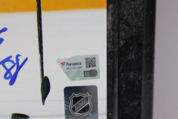 The product is an autographed 8x10 photo featuring Martin Necas wearing a white jersey, signed by him and authenticated by Fanatics Authentic. The photo comes with a plaque and is an original piece. It is associated with the Colorado Avalanche hockey team.