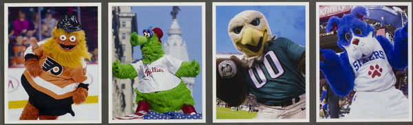 Featured is an 18x40 frame with four 8x10 photos of Philadelphia sports teams mascots. The mascots are Gritty, the Philly Phanatic, Swoop, and Franklin, and under each photo is the teams corresponding medallion. This frame has been professionally framed and matted and is ready for display.. SPECIFICATIONS Autographed By: Team: Philadelphia Eagles Sport: Hockey Authentication: Professional Sports Authenticator (PSA)