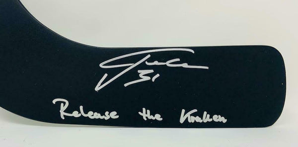 This seattle kraken mini hockey stick has been personally hand-signed by philipp grubauer with the inscription "release the kraken." it is officially licensed by the national hockey league and comes with an individually numbered, tamper-evident hologram from fanatics authentic. to ensure authenticity, the hologram can be reviewed online. this process helps to ensure that the product purchased is authentic and eliminates any possibility of duplication or fraud.
