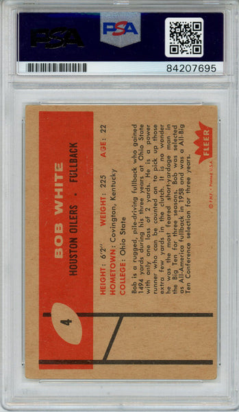 Bob White Autographed 1960 Fleer #4 Rookie Card PSA Slab 43600 The number in the listing title is just an inventory sku for our records and is not the authentication number. This is the exact item that you will receive so please see pictures for condition. This is a trading card that was personally autographed by Bob White. This has been professionally slabbed by Professional Authentication Services (PSA) and includes a certificate of authenticity from Denver Autographs.