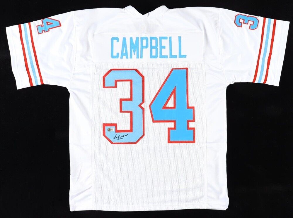 Custom on-field style jersey. Everything is sewn on, size XL. Hand-signed in black felt-tip pen by Earl Campbell (HOF). The lot / autograph(s) includes an official Beckett Authentication Services serially numbered hologram and QR Code Card for authenticity purposes.Authentication: Beckett Hologram with QR Code Card