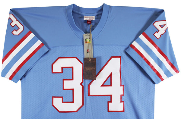 This Autographed Light Blue Mitchell & Ness Throwback Jersey with the inscription of "HOF 91" has been Personally Signed by Earl Campbell of the Houston Oilers. This item is 100% Authentic to include a hologram by Beckett Authentication Services. This item will come with an affixed Beckett Authentication Services (BAS) authentication sticker, which includes a scannable QR code to verify authenticity. Please note that Beckett no longer provides serial-numbered COA cards, and the attached BAS sticker will serve as the complete authentication for this item. This is a BAS Witnessed Protection Program item which means a Beckett Authentication Service representative was present when this item was being signed. We conducted an autograph signing with Earl Campbell where multiples of the same item were signed. While the photographs are representative of this item, the size, placement and strength of the signature may vary. Each item is hand signed, therefore, each autograph is unique. This item can be verified through BAS Witnessed. Multiple sizes available. Reach out for availability.