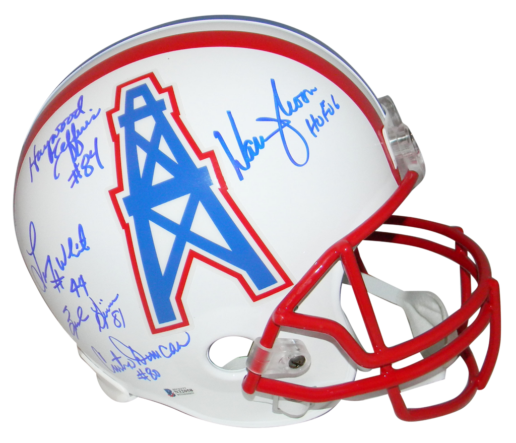 This Houston Oilers Riddell full-size replica helmet has been hand signed by 5 stars of the Run & Shoot offense; Warren Moon, Lorenzo White, Haywood Jeffires, Ernest Givins and Curtis Duncan. This item comes with a certificate of authenticity (COA) from Beckett Authentication Services and was signed in the presence of one of their representatives. You will receive a serial-numbered COA along with a matching serial-numbered sticker on the helmet. The authenticity can be verified online by entering the serial number.Item pictured may not be the exact item you will receive. It will be similar quality, and we guarantee your satisfaction.