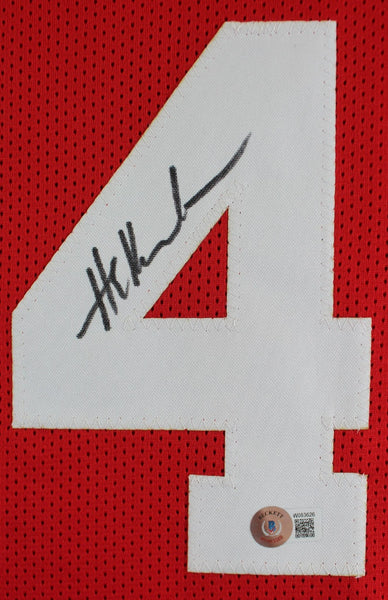 Custom on-court style jersey. Everything is sewn on, size XL. Hand-signed by Hakeem Olajuwon (HOF). The autograph includes an official Beckett Authentication Services serially numbered hologram and QR Code Card for authenticity purposes.Authentication: Beckett Hologram with QR Code Card