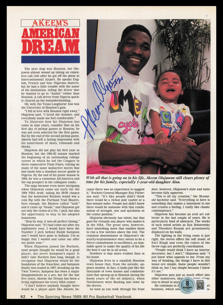 This is an 8x11 Magazine Page Photo that has been hand signed by Hakeen Olajuwon. This item has been certified authentic by Beckett Authentication (BAS) and comes with their tamper-proof QR Code hologram.