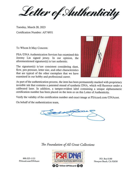 Stitched jersey autographed by Jeremy Lin of the Houston Rockets. The autograph of Jeremy on this jersey was authenticated by a team of experts at PSA/DNA so you can rest assured you are purchasing the real deal. Please note: This item uses a stock image. This means that the signature and authentication number may vary from the main image in the listing. All else will be as described in the listing.