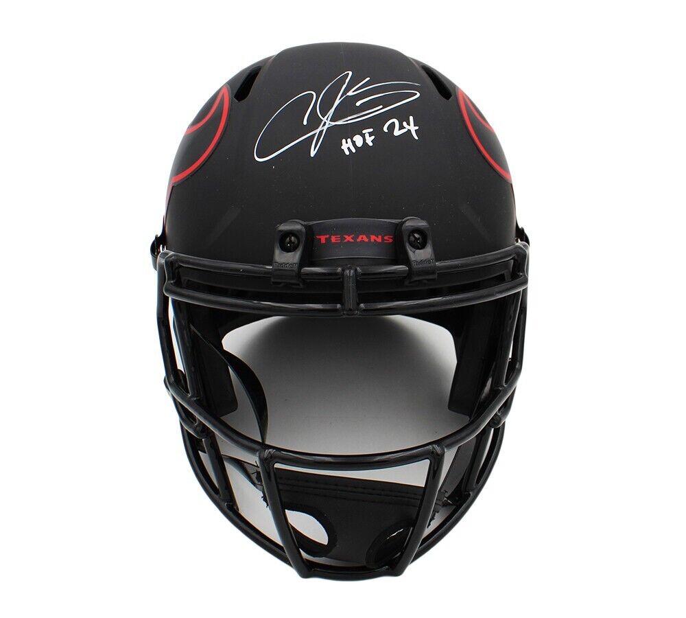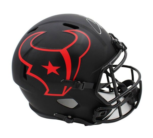 A Houston Texans Speed Replica Eclipse NFL Helmet hand signed by Andre Johnson. The item and signature are in excellent condition. Andre is a former NFL wide receiver. In college he played for the University of Miami Hurricanes. He's a 7x Pro Bowler and was inducted into the Pro Football Hall of Fame in 2024. AUTHENTICATION: The item has been tagged with a SmarTag powered by Prova Technology, which gives you digital access to the items authentication records, including a proof picture from the signing.