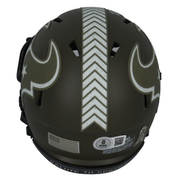 This Houston Texans salute to service mini Riddell Speed helmet has been personally hand-signed by Dalton Schultz. It comes with an individually numbered, tamper-evident hologram from Beckett Authentic. To ensure authenticity, the hologram can be reviewed online. This process helps to ensure that the product purchased is authentic and eliminates any possibility of duplication or fraud.