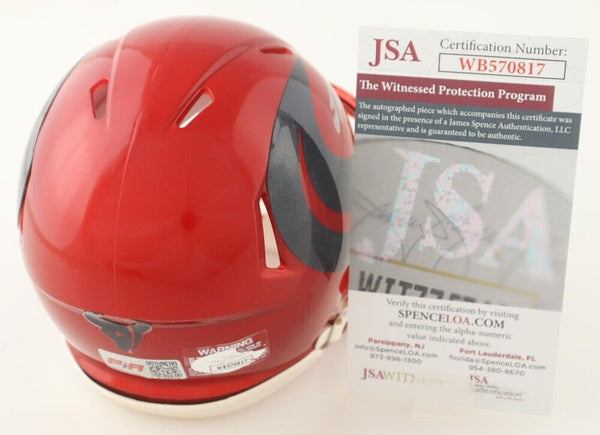 Riddell Houston Texans Speed Mini Helmet. Hand-signed by Joe Mixon.The autograph(s) includes an official James Spence Authentication (JSA) hologram and matching COA for authenticity purposes. The signing of this item was witnessed by JSA.Authentication: JSA COA