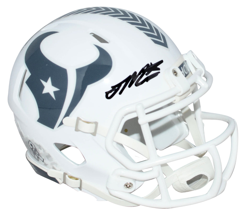 Joe Mixon, star running back for the Houston Texans, has hand signed this Texans Riddell Speed Salute to Service 3 mini helmet at a private signing. This item is authenticated by Beckett Authentication Services and was signed in the presence of one of their representatives. Their tamper-evident hologram featuring a QR code and serial number is on the item. The authenticity can be verified online by entering the serial number or scanning the QR code.Item pictured may not be the exact item you will receive. It will be similar quality, and we guarantee your satisfaction.