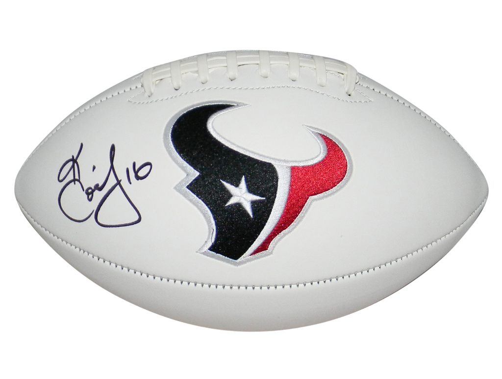 Keke Coutee, star wide receiver for the Houston Texans, has hand signed this Texans white panel logo football at a private signing. This item comes with a certificate of authenticity (COA) from JSA - James Spence Authentication and was signed in the presence of one of their representatives. You will receive a serial-numbered COA along with a matching serial-numbered sticker on the ball. The authenticity can be verified online by entering the serial number.Item pictured may not be the exact item you will receive. It will be similar quality, and we guarantee your satisfaction.