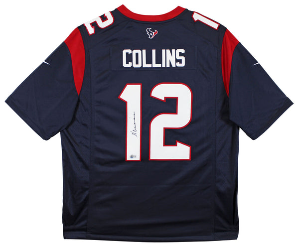 This Autographed Navy Nike Limited Jersey has been Personally Signed by Nico Collins of the Houston Texans. This item is 100% Authentic to include a hologram by Beckett Authentication Services. This item will come with an affixed Beckett Authentication Services (BAS) authentication sticker, which includes a scannable QR code to verify authenticity. Please note that Beckett no longer provides serial-numbered COA cards, and the attached BAS sticker will serve as the complete authentication for this item. This is a BAS Witnessed Protection Program item which means a Beckett Authentication Service representative was present when this item was being signed. We conducted an autograph signing with Nico Collins where multiples of the same item were signed. While the photographs are representative of this item, the size, placement and strength of the signature may vary. Each item is hand signed, therefore, each autograph is unique. This item can be verified through BAS Witnessed. This is a XX-Large sized Jersey.