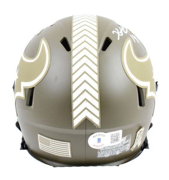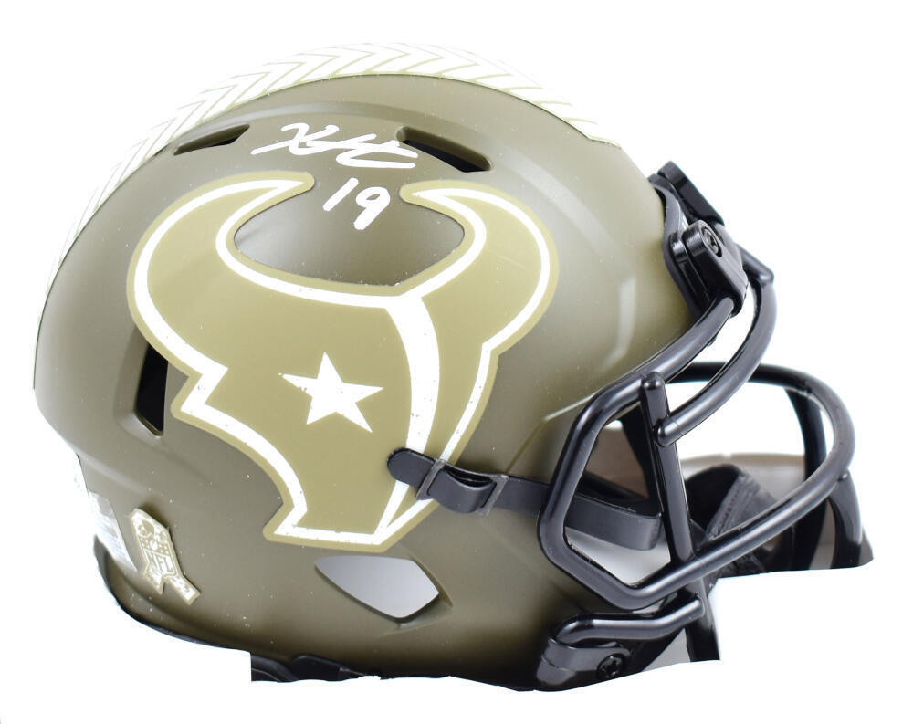Xavier Hutchinson Autographed Houston Texans Salute to Service Speed Mini Helmet-Beckett W Hologram *White This is a Hand Autographed Helmet of Xavier Hutchinson of The Houston Texans. This is a Riddell Football Salute to Service Speed Mini Helmet. This item has a Beckett Witness Authentication, which Comes with a Beckett #'ed hologram and a QR code for verification. You can view this item on the Beckett website and it shows when and where the item was signed. It was signed either at a public autograph appearance or a Private Signing. This is a stock photo of the item. Although you may not receive this exact item, the item you receive is virtually identical and brand new in great shape.
