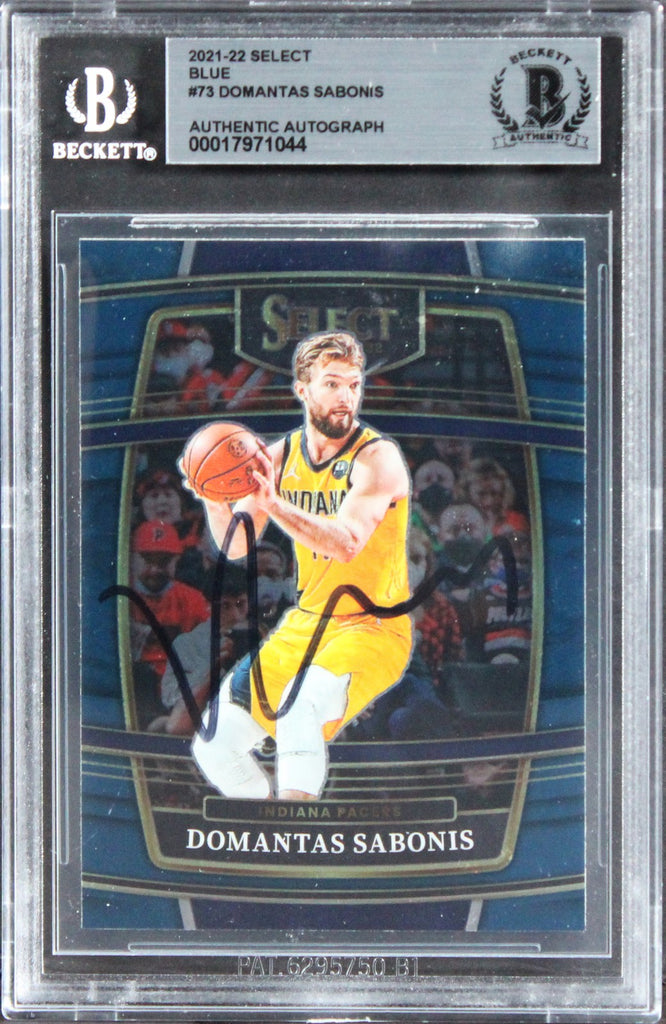 This Autographed 2021 Select Blue #73 Card has been Personally Signed by Domantas Sabonis of the Indiana Pacers. This item is 100% Authentic, it comes slabbed and authenticated by Beckett Authentication Services. The authenticity can be verified on Beckett Authentication Services website.